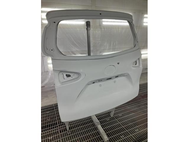 新品のバックドアはサフェーサーを塗装します。 塗装ブースで上塗りします。