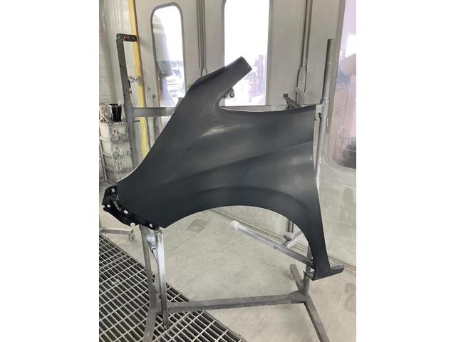左フロントドアの新品パネルにサフェーサーを塗ります。