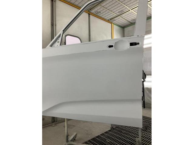 左フロントドアの新品パネルにサフェーサーを塗ります。