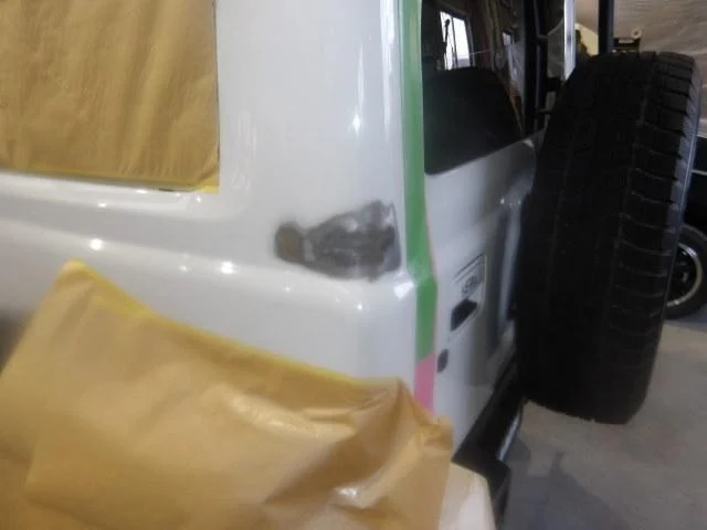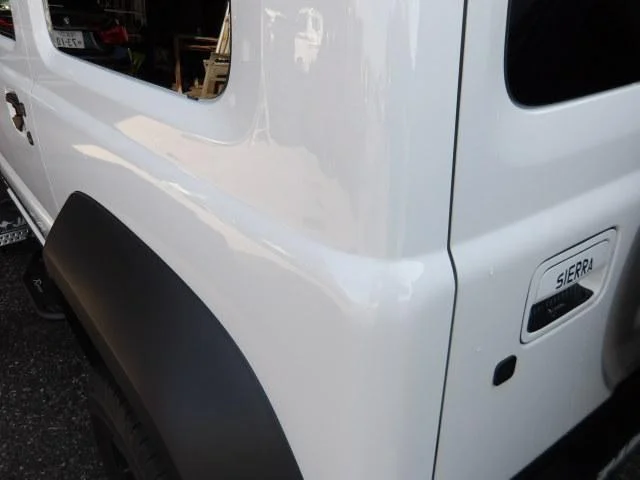 スズキ ジムニーシエラ 左リアフェンダ 鈑金塗装 26U 白いシエラはかっこよかったです。