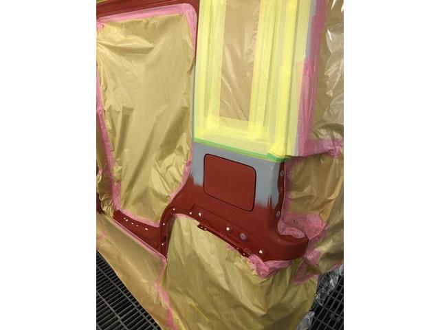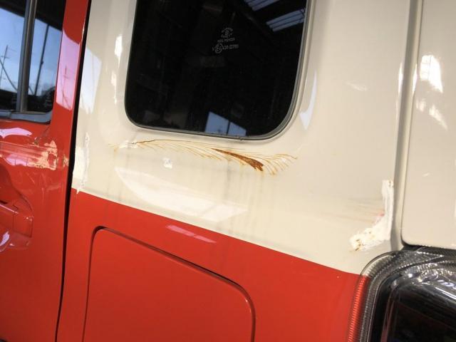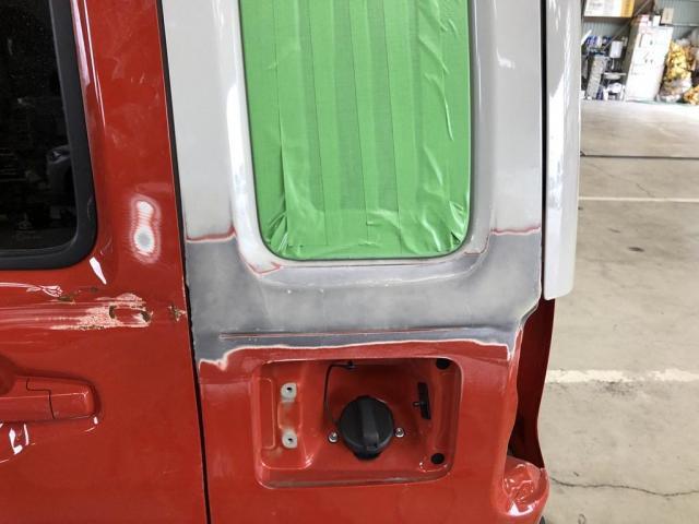 リアフェンダーの凹みはガラスのすぐ下 ガラスを外して作業したいですが、安く修理するためにガラスは外さないで作業しました。 左リアフェンダの鈑金が完了
